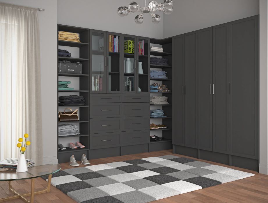 Dark grey wooden closets with built-in shelves.