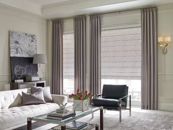 Blending style and technology, our Hunter Douglas PowerView window treatments open and close with the touch of a button or voice command. Just left for vacation and forgot to close your shades?